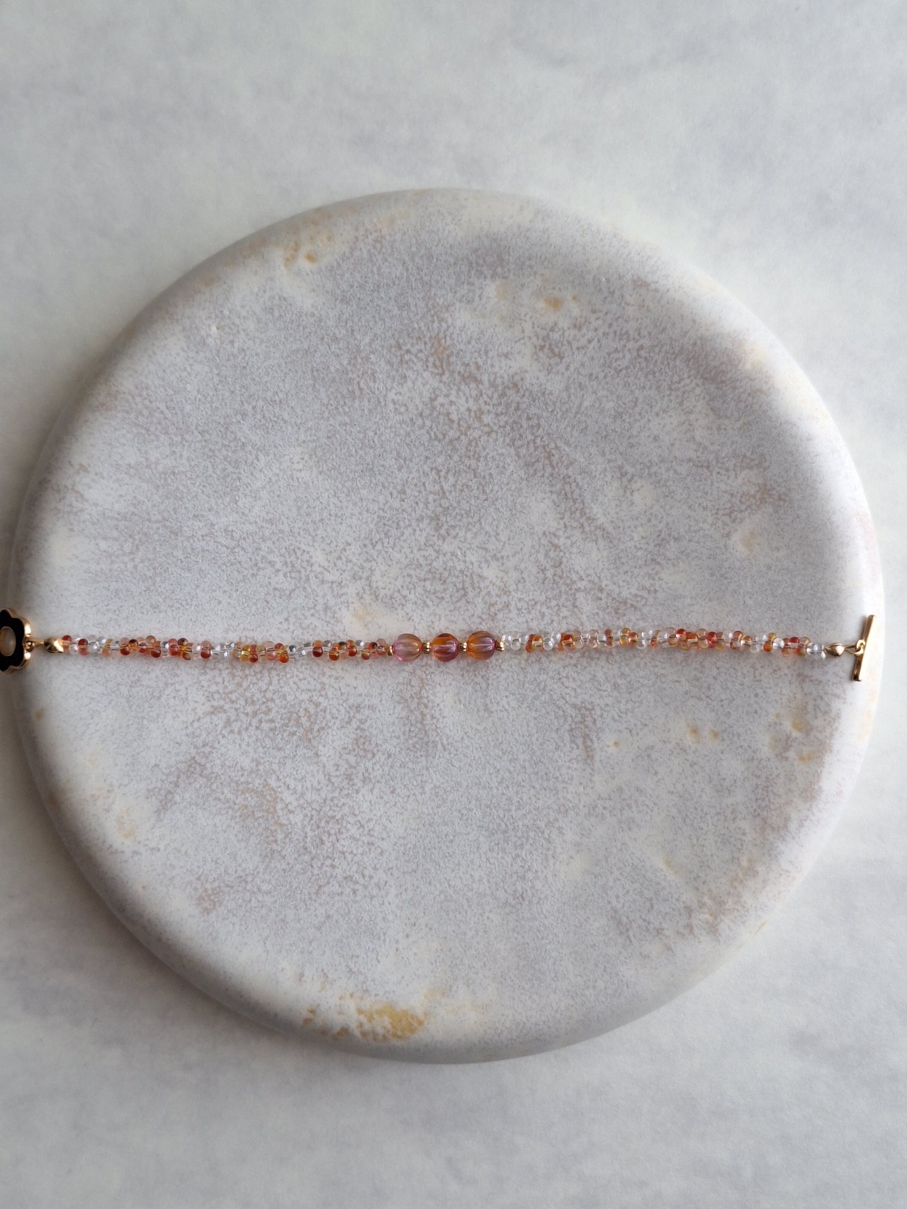 光を受けるたび、透明な中に赤とオレンジが静かに浮かび上がります。
