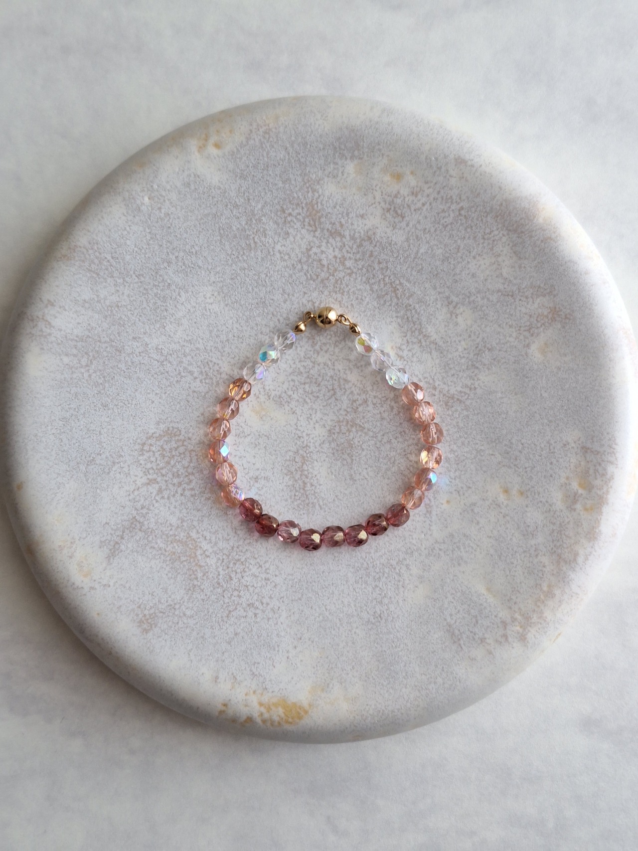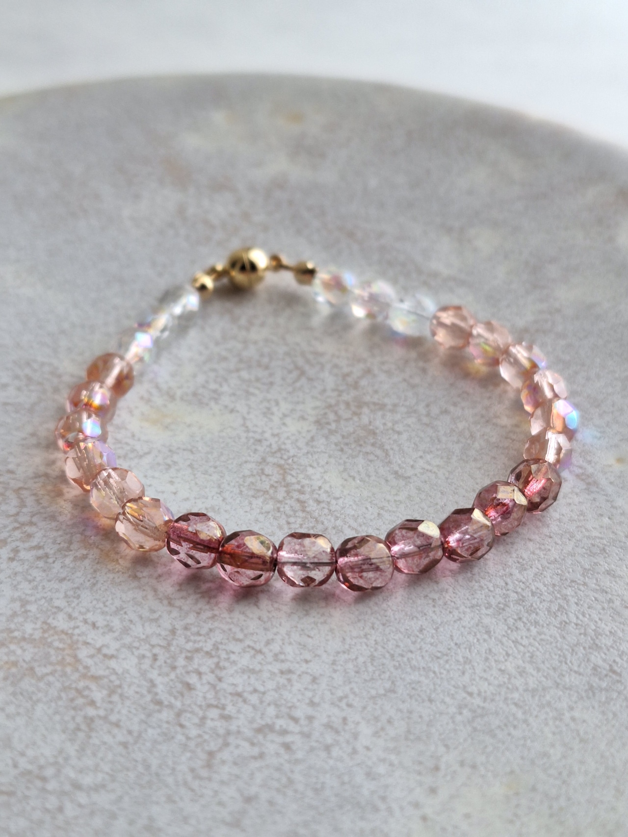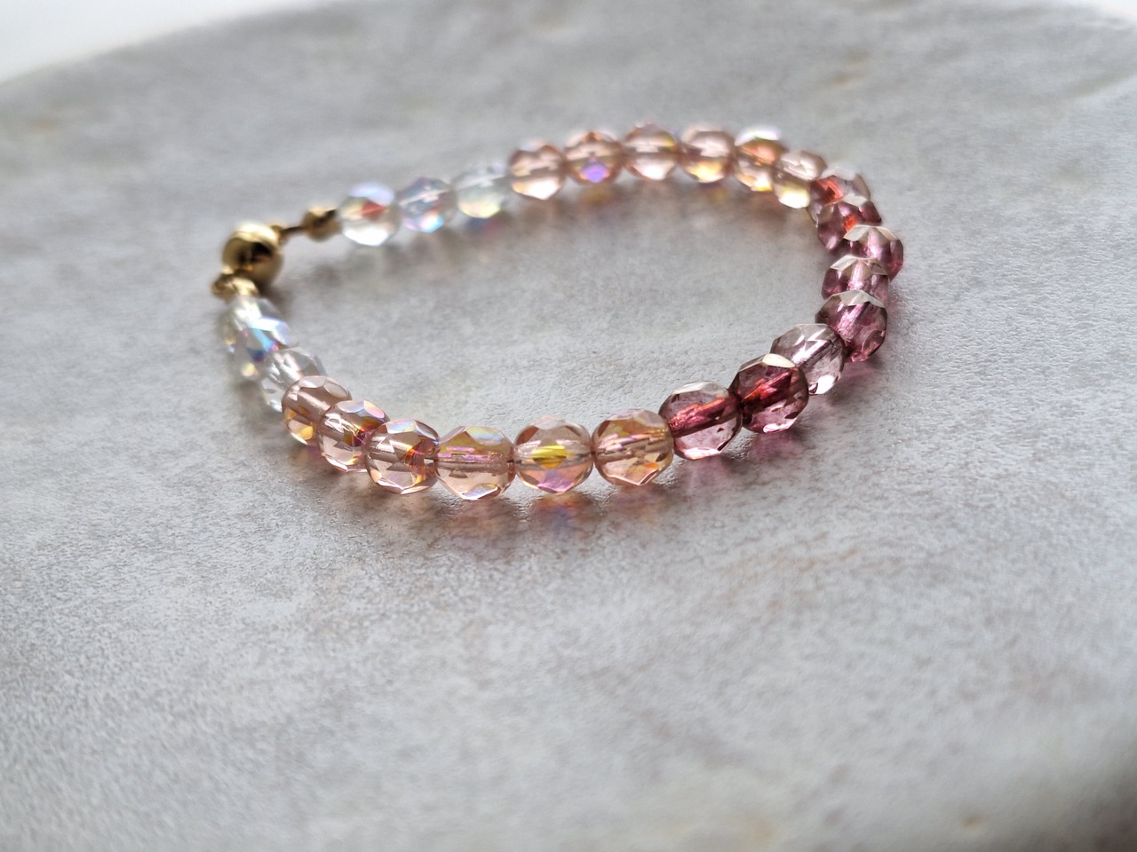 淡いピンクからローズカラーへと移ろう、多面カットガラスビーズを連ねたブレスレット。